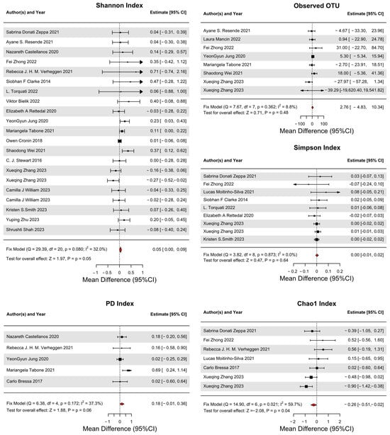 Forest plots of gut microbiota diversity in adults [,,,,,,,,,,,,,,,,,,,,,].