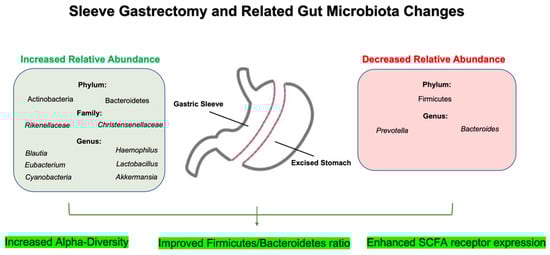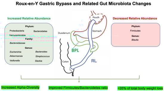 Although mechanical restriction and malabsorption play a significant role in weight loss following bariatric surgery, the full extent of its effects can also be partially attributed to changes in regulatory signaling via gut–brain communication, initiated by conserved changes in gut microbial composition [9,10]. It has been shown that RYGB increases alpha-diversity and improves the Firmicutes/Bacteroidetes ratio, but to a lesser extent compared to SG [36]. These post-RYGB changes were associated with increases in Escherichia and Bacteroides. These findings are consistent with three other studies that showed post-RYGB increases in concentrations of the phylum Proteobacteria and family Bacteroidaceae, with concurrent decreases in the phylum Firmicutes [10,37,38] (Figure 1). Interestingly, it has also been shown that up to 37% of increased bacteria following RYGB belong to the phylum Proteobacteria, with these alterations in gut microbiota being accompanied with positive effects on genes associated with white adipose tissue expression [39]. Interestingly, the transfer of gut microbiota from RYGB-treated mice to germ-free mice led to weight loss in both germ-free mice as well as sham-operated mice, with germ-free mice exhibiting a greater decrease in fat mass than sham-surgery counterparts [10]. It is also important to note that many of the microbial changes occur distant from the area of surgical manipulation, typically observed in the distal gut [10].