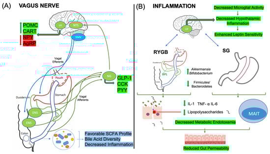 (A,B) Microbiota–Gut–Brain Axis following RYGB and SG. (A) Vagus Nerve. Sensory information from vagal afferents in the ENS is conveyed to the nodose ganglion. RYGB-induced changes in microbiota lead to favorable SCFA profile, increased bile acid diversity, and decreased inflammation. RYGB alters neuronal activity enhancing satiety signaling through GLP-1, CCK, and PYY. The NG further transmits signals relayed from the gut to the NTS and lateral hypothalamus. At the level of the lateral hypothalamus, POMC, cocaine-, and CART are upregulated while NPY and AgRP are down-regulated following RYGB. Vagal efferents from the dorsal motor nucleus of vagus relay brain signals to the gut to influence gut peptides. (B) Inflammation. Microbiota-related changes including increases in Akkermansia and Bifidobacterium, as well as overall improvements in the Firmicutes/Bacteroidetes ratio mitigate inflammatory processes in the periphery and brain. In the brain, hypothalamic inflammation is attenuated due to decreased microglial activity, contributing to improved leptin sensitivity. In the periphery, release of inflammatory cytokines and serum lipopolysaccharides are decreased, thereby decreasing metabolic endotoxemia. In SG, mucosa-associated invariant T-cell expression is enhanced in colonic tissue. These changes collectively improve gut barrier integrity and reduce gut leakage. Abbreviations: POMC, proopiomelanocortin; CART, cocaine-, and amphetamine-regulated transcript; NPY, neuropeptide Y; AgRP, agouti-related peptide; LH, lateral hypothalamus; NTS, nucleus tractus solitarius; DMV, dorsal motor nucleus of vagus; NG, nodose ganglion; GLP-1, glucagon-like peptide 1; CCK, cholecystokinin; PYY, peptide YY; ENS, enteric nervous system; SCFA, short-chain fatty acids; RYGB, Roux-en-Y gastric bypass; SG, sleeve gastrectomy; BPL, Biliary-Pancreatic Limb; IL-1, interleukin-1; TNF-α, tumor necrosis factor alpha; IL-6, interleukin-6; MAIT, mucosa-associated invariant T-cell.