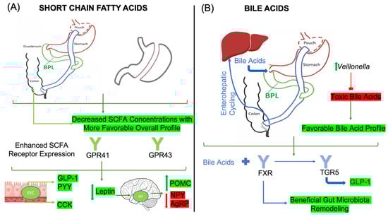 Microbiota–Gut–Brain Axis following RYGB and SG. (A) Short-Chain Fatty Acids. Both procedures reduce overall SCFA concentrations due to nutrient intake restriction; however, overall, SCFA profile is more favorable. Expression of nutrient-sensing receptors, GPR41 and GPR43, is enhanced in colonic mucosa following bariatric surgical procedures. Activation of nutrient-sensing receptor causes release of GLP-1, PYY, and CCK from enteroendocrine cell. It also influences leptin activity by relaying signals to the brain to alter POMC, NPY, and AgRP neuronal expression. These changes contribute to the feeling of satiety following bariatric surgery. (B) Bile Acids. Primary bile acids are made in the liver and released into the biliary-pancreatic limb in Roux-en-Y gastric bypass. Roux-en-Y reduces the distance to the terminal ileum where bile acids undergo enterohepatic cycling to be further processed and re-released into the intestinal tract. At the same time, favorable changes in gut microbiota profile following the procedure, such as relative increases in bile acid-sensitive Veillonella, further suppresses toxic bile acid synthesis, promoting an overall more favorable bile acid profile. Bile acids bind to Farsenoid X Receptor and Takeda G protein-coupled receptor 5 to influence satiety peptide expression. Farsenoid X Receptor activity can further activate Takeda G protein-coupled receptor 5 as well as reciprocally remodeling gut microbiota. Takeda G protein-coupled receptor 5 increases GLP-1 release. Abbreviations: BPL, biliary-pancreatic limb; SCFA, short-chain fatty acids; GPR41, G-protein coupled receptor 41; GPR43, G-protein coupled receptor 43; EEC, enteroendocrine cells; GLP-1, glucagon-like peptide 1; CCK, cholecystokinin; PYY, peptide YY; LH, lateral hypothalamus; POMC, proopiomelanocortin; NPY, neuropeptide Y; AgRP, agouti-related peptide; FXR, Farsenoid X receptor; TGR5, Takeda G protein-coupled receptor 5; RYGB, Roux-en-Y gastric bypass.