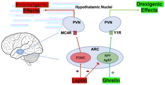 - Vohra, M.S.; Benchoula, K.; Serpell, C.J.; Hwa, W.E. AgRP/NPY and POMC neurons in the arcuate nucleus and their potential role in treatment of obesity. Eur. J. Pharmacol. 2022, 915, 174611. [Google Scholar] [CrossRef] [PubMed]