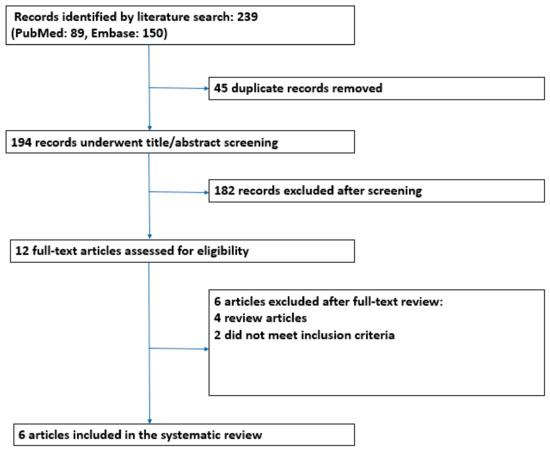 As shown in Figure 1, our literature search identified 239 records, of which six were eligible for inclusion after full-text review. The characteristics of the included studies are summarized in Table 1. Four were interventional studies (two randomized controlled trials—RCT [25,26], two open-label prospective interventional studies [27,28]), and two were observational studies (one retrospective cohort study [29] and one cross-sectional study [30]). Studies excluded after full-text review and the reasons for exclusion are reported in Supplementary Materials. Overall, the risk of bias among the included studies was high.