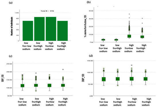 Relationship between fructose and sodium consumption and systolic and diastolic blood pressures. (a) The cohort was equally distributed across the four dietary groups according to fructose and sodium intake. (b) The average percentage of calories consumed in the low-fructose groups was 3.02 ± 1.01% and 3.00 ± 1.02% for low and high sodium, respectively. The average percentage of calories consumed in the high-fructose groups was 8.29 ± 3.76% and 7.34 ± 2.78% for low and high sodium, respectively. (c) The individuals in the low-fructose + high-sodium group had lower SBP compared to the individuals in low-fructose + high-sodium and high-fructose + high-sodium groups (p < 0.05). (d) The individuals in the high-fructose + low-sodium group had higher DBP compared to the low-fructose + low-sodium group (* p < 0.05).