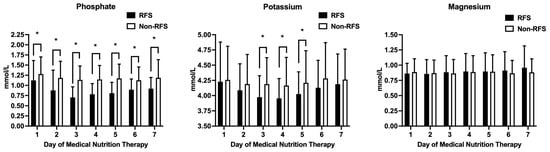 Differences in phosphate, magnesium, and potassium levels in the first seven days after the start of medical nutrition therapy. Mean levels of electrolytes are given in mmol/L. The black columns represent RFS patients, and the white columns represent non-RFS patients. Asterisk (*): p < 0.05. Abbreviations: RFS, refeeding syndrome.
