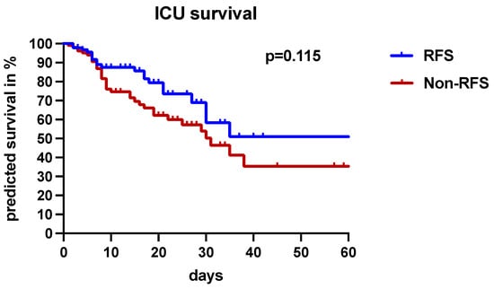 Presence of RFS and ICU survival. The study population was divided into patients with RFS, represented by the blue line, and without RFS, represented by the red line. A Kaplan–Meier-based analysis was used for the calculation of ICU survival. Patients without RFS were associated with a lower predicted survival, but the results did not reach the significance level (p = 0.115 according to log-rank test).