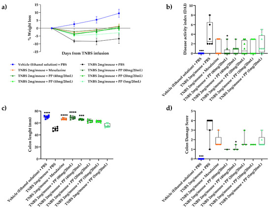 The mice were randomly divided in different groups (n = 8 per each group) as follows: normal, not TNBS-treated (Control group); TNBS-induced colitis (TNBS vehicle-treated group); and TNBS-induced colitis mice treated with different types of products including the drug positive control mesalazine.