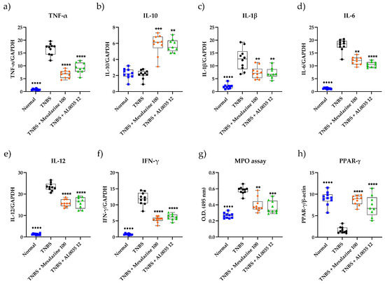 The levels of the inflammatory cytokines TNF-α, IL-1β, IL-6, IL-12 and IFN-γ in the colon tissue were significantly enhanced in the TNBS group with respect to those in the Control group (p < 0.0001), whereas treatment with mesalazine or AL0035 significantly restrained the pro-inflammatory cytokine levels (p < 0.0001) (Figure 3a,c–f). In the TNBS-induced colitis group, the anti-inflammatory cytokine IL-10 levels in colonic tissue were significantly suppressed (p < 0.01 or p < 0.001) (Figure 3b), suggesting that both AL0035 and mesalazine treatments revealed to slow down this process. Also, TNBS-induced colitis significantly increased the MPO activity in the colon compared to that measured in the Control mice (p < 0.0001), while the AL0035 and MS groups were shown to have significantly decreased MPO accumulation in colonic tissue compared to the TNBS-vehicle-treated group (p < 0.01 and p < 0.001; Figure 3g). These results indicated that AL0035 and mesalazine have a significant effectiveness in easing the severity of colitis. In addition, PPAR-γ resulted in a downregulated colon in the TNBS-induced colitis group, whereas AL0035 and mesalazine counteracted this downregulation (p < 0.0001) (see Figure 3h).