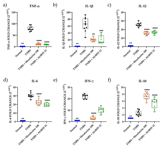 With respect to the TNBS group levels, treatment with AL0035 or mesalazine significantly inhibited pro-inflammatory cytokines (p < 0.05-p < 0.0001) levels and favoured the expression of IL-10 (p < 0.0001) (Figure 4).