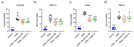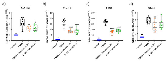 The western blot analysis of different lymphocytes populations (GATA-3, MCP-1, T-Bet, NK1.1) revealed a significant decrease induced by AL0035 or mesalazine (Figure 6a–d). Moreover, a reduction in the level of Monocyte chemoattractant protein-1 (MCP-1/CCL2) was also found after AL0035 or mesalazine treatment. Analogue results were observed by the qPCR evaluation of the same immune cells population (Figure 7a–d).