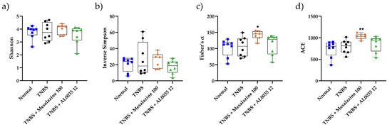 The V3-V4 region of the 16S rRNA gene amplified from the colonic DNA-extracted samples was analyzed. The microbiota diversity was determined according to the Fisher’s Shannon and Simpson indices by using the observed bacterial species. Among the four groups, no statistical difference was observed for the Shannon, and Simpson indices, whereas in the AL0035 and MS groups, with respect to the TNBS group, the Fisher’s index turned out to be higher (Figure 8a–d). The observed species in the TNBS-treated groups were similar to those in the Control group (p > 0.05), whereas AL0035 tended to significantly increase the abundance of the observed species. These results suggest that AL0035 treatment increased the diversity of the gut bacterial microflora.