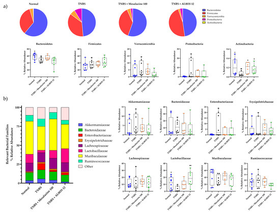 In the detailed taxonomic analysis, the TNBS group presented a decrease in the relative abundance of Bacteroidetes and Actinobacteria and a rise in the relative abundance of Proteobacteria with respect to the normal group. In contrast, the abundance of the phylum Firmicutes was increased in the AL0035 and mesalazine groups, whereas Proteobacteria was found to be downregulated (Figure 9a).
