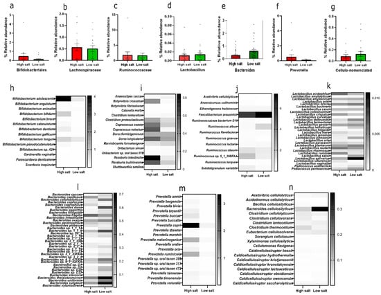 By class, HSD has a higher abundance of Bifidobacteriales than LSD (Figure 2a) and this is chiefly Bifidobacterium adolescentis (Figure 2h). Bacteria that are cellulose-related in nomenclature constitute about 2.8% in the low-salt gut compared to 1.7% in the high-salt gut (Figure 2g). To the best of our knowledge, this is the first report about the abundance of cellulose-related bacteria in the gut in relation to dietary salt. The mean AOAC fibre consumed by an HSD recipient was 16.8 g/100 g and LSD was 17.5 g/100 g (Supplementary S7). Despite a similar overall fibre consumption pattern in both groups, these cellulose-degrading bacteria are more abundant in the low-salt gut and chiefly dominated by Bacteroides cellulosilyticus (Figure 2n). Other comparative taxonomy includes Lachnospiraceae, dominated by Roseburia intestinalis (Figure 2b,i), and Ruminococcaceae, dominated by Faecalibacterium prausnitzii (Figure 2c,j), Lactobacillus (Figure 2d,k), Bacteroides (Figure 2e,l), and Prevotella (Figure 2f,m).