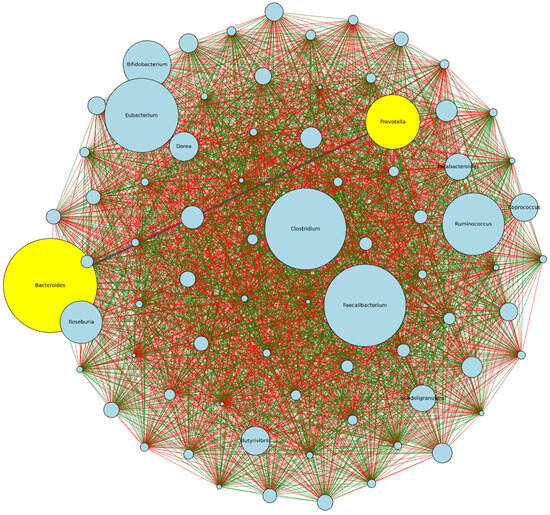 Correlation and network analysis of genera. Each node (circle) represents a genus, and the size of the node corresponds to the average abundance of the genus across both dietary classifications. The lines (edges) connecting the nodes represent the strength and direction of the correlation between the connected genera. Green edges (-) indicate a positive correlation. Red edges (-) signify a negative correlation. HSD, n = 3; LSD, n = 3.