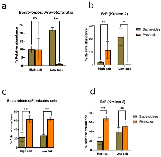 Microbiome studies currently use a shift in the Bacteroidetes/Firmicute ratio as a measure of dissimilar conditions (e.g., healthy vs. disease states) [39,40,41]. However, Figure 5c indicates that there is no clear difference between high salt consumption and low salt consumption based on phyla ratios. Both HSD and LSD show similar 2-fold variance for the F/B ratio. Interestingly, there is significant large variation between these two cohorts when a genus-based Bacteroides/Prevotella (B/P) ratio is applied even when two different taxonomy platforms are compared (Figure 5a,b). This suggests that low dietary salt intake correlates with increased Bacteroides and reduced Prevotella. In short, analyses of results from both taxonomic tools indicate that there are low chances (1.1–2.2%) of randomly observing interaction in an experiment of this size. Further supportive statistics for genus-based ratios is available in the supplemental information (Supplementary S3).