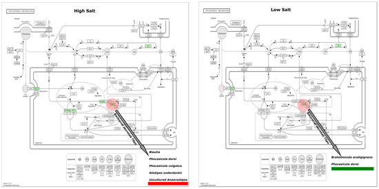 Meanwhile, the presence of sodium reabsorption genes in the ENaC of HSD (but not LSD) may suggest that there might be a response or adaptation mechanism as a result of high sodium in the gut. ENaC is crucial for sodium absorption in various tissues, including the kidneys and gastrointestinal tract [66,67]. An increased presence or activity of SCNN1B and SCNN1G could potentially reflect the body’s effort to maintain sodium homeostasis in the face of high dietary sodium [68,69]. The lack of these ENaC genes in LSD (but not HSD) could be part of a compensatory mechanism that is less active or unnecessary when the sodium intake is lower [70]. Bacterial proteases such as those from Pseudomonas aeruginosa and Serratia marcescens are capable of activating the ENaC signalling pathway [71,72,73,74]. However, the precise mechanism of ENaC modulation by proteases has not been fully elucidated as the responsible protease(s) for the proteolytic activation of ENaC is yet to be identified in vivo [75]. Notwithstanding, reconstructed metabolic profiles in this study indicate that high sodium intake activates ENaC at the apical membrane via SCNN1B and SCNN1G genes. Previous studies have shown that HSDs increase ENaC activity and sodium absorption, contributing to hypertension via enhanced sodium entry in the kidneys and immune system [13,76,77,78,79,80,81].