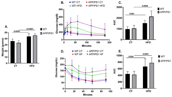 As expected, the mice fed with the HFD showed an increased body weight when compared to the mice fed with conventional chow (p = 0.0024 for WT, p ≤ 0.0001 for APP/PS1) (Figure 1A). Similarly, following the HFD induced alterations in peripheral glucose metabolism, as evidenced by both GTT (Figure 1B,C) and ITT (Figure 1D,E). Results showing the deleterious effect of following an HFD on AD pathology according to the genotype were previously published by our group [45,46,47]. Briefly, feeding APP/PS1 mice with an HFD aggravated the animals’ learning and memory abilities together with increasing neuroinflammation, brain amyloid β (Aβ) production and plaque burden.