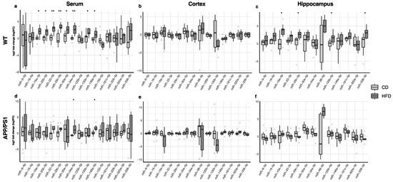 Differences in the expression of miRNAs in WT and APP/PS1 mice fed with the high-fat diet compared to their counterparts fed with regular chow. (a,d) Serum, (b,e) cortex and (c,f) hippocampus. At least 11 animals were considered in each experimental group. Student’s t test or Mann–Whitney test and Benjamini–Hochberg correction (FDR, * Padj < 0.05, ** Padj < 0.01) were performed. Grey light dots represent outliers.