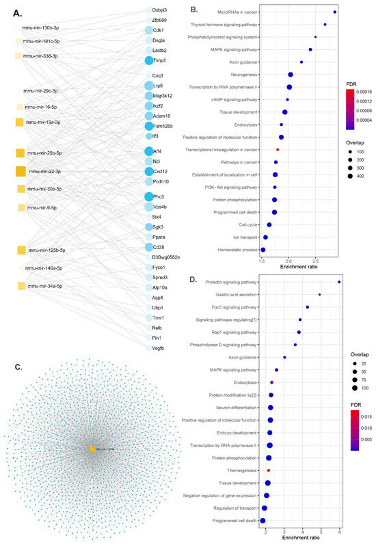 Functional enrichment analyses. (A) Network diagram of 13 miRNAs and potential target genes (blue dots are nodes representing the differentially expressed genes, and squares indicate the miRNAs; their size indicates the number of targeted genes), (B) significant KEGG pathway and GO enrichment analysis of candidate hub genes on the predicted targets of each up-regulated miRNA (dot size reflects the number of genes in each GO pathway, FDR, Padj < 0.05), (C) the network diagram of mmu-miR-19a-3p overlaps for serum and brain tissues (blue dots for target genes), (D) significant KEGG pathways and GO functions for the target genes of mmu-miR-19a-3p (dot size reflects the number of genes in each GO pathway, FDR, Padj < 0.05). Abbreviations: [1] signaling pathways regulating pluripotency of stem cells; [2] protein modification by small protein conjugation or removal, FDR; false discovery rate.