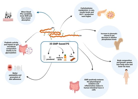 Previous studies have suggested an association between PKU dietary treatment and higher glycaemic index (GI) and triglyceride glucose index (TyG), which seem to mainly reflect peripheral insulin resistance [15]. These findings have been attributed to the higher GI carbohydrate intake in PKU children than in healthy peers [16]. An observational case–control study in children with PKU found that dietary GI and glycaemic load (GL) are higher in children with PKU than in healthy children [16]. Moreover, focusing on fibre intake, even though children with PKU consume more vegetables and fibre, especially soluble fibre, their gut microbiota composition is not favourable, with important alterations in Firmicutes phylum and a reduction in butyrate-producing genera [17,18]. A recent systematic review and meta-analysis examining PKU microbiota [19] highlighted the impact of diet in PKU, together with the administration of PSs and/or other supplementations, on the alterations in microbial communities, potentially influencing not only carbohydrate metabolism but also AA biosynthesis and gastroenterological symptomatology. At present, no data are available on the GI and GL of PSs for PKU, but the intake of Phe-free amino acids has been shown to cause a significantly higher insulin peak after the intake of Phe-free L-AA PSs in both humans and rats [20]. A putative explanation is that amino acids, especially leucine, which is contained in large amounts in Phe-free amino acid supplements, act as important triggers of insulin secretion [21]. In a study on a murine model, Pena et al. [22] analysed the chronic effects of casein (CAS), free amino acids (L-AAs), and GMP on glycaemic metabolism by assessing its biochemical markers in blood. No significant differences in glycaemia were observed among the three treatments, while insulin levels were significantly higher in rats fed with GMP than those fed with L-AAs, in contrast to what was expected. This finding is probably because the post-absorptive levels of amino acids were lower, and the insulin levels were only measured at the end and not during the experiment. In fact, the GMP diet contained similar amounts of leucine to those from L-AAs, with the exception that around half of the amount came from intact proteins and the other half from free amino acids. Furthermore, isoleucine and valine, which are insulinogenic amino acids as well, only came from original GMP without additional amino acids. However, regarding HOMA-IR, a surrogate measure of insulin sensitivity, a significant difference was observed between GMP and L-AAs, indicating that rats fed with L-AAs were 3-fold more insulin-resistant than those fed with GMP. In fact, those products from which fats are removed often have more added sugars. Future research should consider the insulinaemic index and not just the glycaemic load of PSs. Always focusing on the impact of GMP-based PSs on glucose metabolism, it must be considered that GMP is a casein derived from whey. A double-blinded randomised trial confirmed that whey protein stimulates fasting insulin while casein stimulates circulating insulin-like growth factor 1 (IGF-1), highlighting that milk protein fractions can have different effects [23].