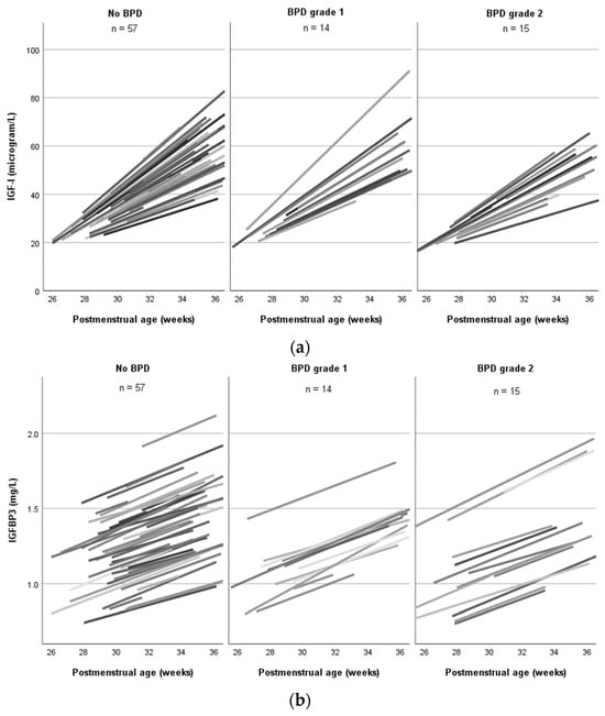 This study showed that, in particular, before 35 weeks PMA, low IGF-I levels and a slower increase in IGF-I were associated with higher odds of BPD in preterm infants. IGFBP-3 showed a similar pattern but was not significant in the multivariable analysis. Gestational age and donor human milk consumption were significant confounders in the association between IGF-I and BPD.