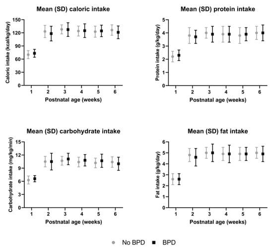Nutritional intake in preterm infants with and without BPD up to 6 weeks postnatal age.