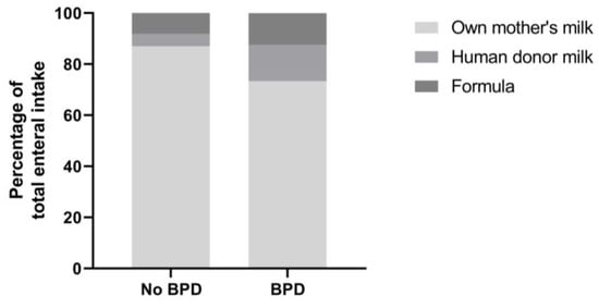 However, in our study, the participants were mainly fed their own mother’s milk. The absolute quantity of donor human milk was small and did not correlate with the occurrence of BPD. Importantly, the infants predominantly fed donor human milk for at least a week had a lower gestational age and birth weight compared to the infants predominantly fed donor human milk for less than a week (see Supplementary Materials Section S2.2). Therefore, our findings remain speculative.