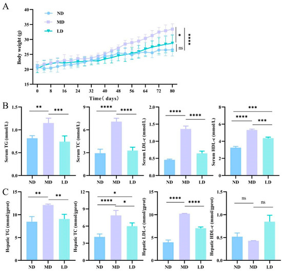 Moreover, 24 five-week-old SPF male C57BL/6n mice (Beijing Vital River Laboratory Animal Technology Co., Ltd., Beijing, China) were acclimated for one week under standard conditions at the animal facility of Nanchang Royo Biotech, Co., Ltd., Nanchang, China, with a 12 h light/dark cycle, during which food and water were freely available. After the adaptation period ended, all mice were randomly divided into three groups (n = 8/group) using a random number table. Mice in the ND group (normal diet group) were provided with a normal diet (19.5% protein, 4.6% fat, 2% fiber, SPF (Beijing) Biotechnology Co., Ltd., Beijing, China) and water. Mice in the MD group (model group) and the LD group (L. plantarum ZDY2013 administration group) were given an HFFC diet (40% fat, 22% fructose, 2% cholesterol, Trophic Animal Feed High-Tech Co., Ltd., Nantong, China) and normal drinking water [19]. Meanwhile, the ND group and the MD group were orally gavaged with 0.1 mL PBS, and the LD group was orally gavaged with 0.1 mL 1 × 109 CFU/mL L. plantarum ZDY2013. The body weight of mice was transcribed every four days. Mice were euthanized with ether after intervention for 12 weeks. Liver samples, cecum contents, serum, and colons were gathered and saved at −80 °C. We referred to the method of Chen et al. to calculate the liver weight index and Lee’s index [20].