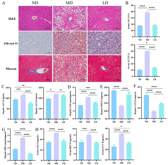 In this study, H&E staining, Oil Red O staining, and Masson staining of liver samples were used to assay histological changes. As shown in Figure 2A, moderate-to-marked macrovesicular steatosis was developed in the MD mice via H&E staining, whereas the steatosis grade was great lower in the LD group. Compared with the ND mice, the MD mice showed a notable accumulation of liver lipid droplets, as revealed by Oil Red O staining, while the LD mice were significantly lower in liver lipid droplets compared to the MD mice. Masson staining revealed that, compared to the ND mice, the MD mice exhibited significant liver collagen deposition, while the LD mice showed significantly lower liver collagen deposition compared to the MD mice.