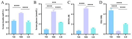 Insulin resistance is a hallmark of NAFLD, which is important to the pathogenesis and progression of diseases associated with obesity. Moreover, IR is an important factor in determining the progression from NAFLD to NASH [25]. In elucidating the impact of L. plantarum ZDY2013 administration on IR in mice fed with an HFFC diet, we detected the content of serum glucose and insulin. Compared to the ND mice, the MD mice exhibited significantly higher levels of blood glucose, insulin content, and HOMA-IR but lower ISI values. Compared with the MD mice, the LD mice showed evidently lower levels of blood glucose, insulin content, and HOMA-IR, while ISI was higher (Figure 3A–D). Therefore, L. plantarum ZDY2013 improved IR in mice fed with an HFFC diet.