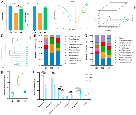 Alpha and beta diversity were analyzed to assess the intestinal microbiota differences among the groups. The MD group had significantly lower alpha diversity indexes (Shannon, 3.75 ± 0.70, and Simpson, 0.81 ± 0.09) than the ND group (Shannon, 5.35 ± 0.18, and Simpson, 0.93 ± 0.01). After the intervention of L. plantarum ZDY2013, the two alpha diversity indices were evidently higher in comparison with the MD group (Figure 4A). β-diversity analysis (PCoA and UPGMA) showed that the composition of intestinal microbiota in the LD group mice was analogous to the ND group mice but inconsistent with the MD group mice (Figure 4B–D).