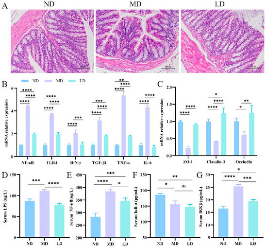 Impacts of L. plantarum ZDY2013 on the intestinal inflammation (A) colonic H&E staining; (B) mRNA levels of NF-κB inflammation pathway cytokines and (C) the tight junctional protein in the colon; the concentration of (D) LPS, (E) NF-κB, (F) IκB-α, and (G) IKKβ in serum. * p < 0.05; ** p < 0.01; *** p < 0.001; **** p < 0.0001; ns, not significant.