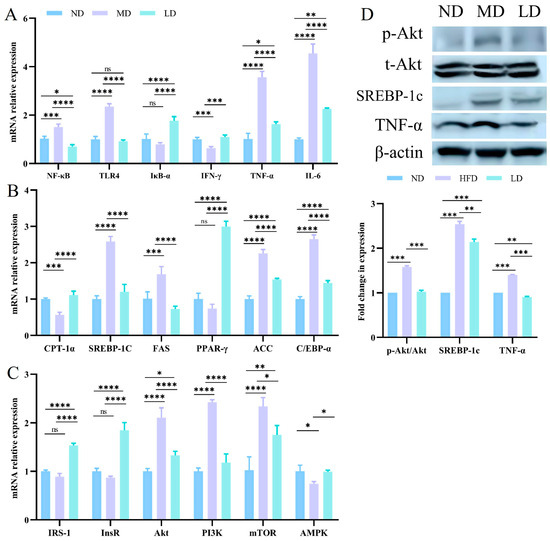 Hepatic lipid metabolism is primarily regulated by multiple associated pathways, such as fatty acid synthesis pathways and β-oxidation [27]. β-oxidation can indicate hepatic lipid accumulation, as it is the critical way in lipid metabolism [28]. The mRNA expression of genes concerning lipid oxidation (PPAR-γ and CPT-1α), lipogenesis (FAS, ACC, C/EBP-α, and SREBP-1c), and PI3K/Akt pathway-related genes were investigated to explore the impact of L. plantarum ZDY2013 on lipid deposition in the liver. In contrast to the ND mice, the mRNA expression level of CPT1α was significantly lower in the MD mice, while the mRNA expression of ACC, C/EBP-α, FAS, and SREBP-1c was significantly higher. However, in contrast to the MD mice, the mRNA expression of CPT1α and PPAR-γ in the LD mice was significantly higher, while the mRNA expression of ACC, C/EBP-α, FAS, and SREBP-1c was significantly lower (Figure 6B). Similarly, Lactobacillus plantarum LG42 can effectively downregulate the expression of the ACC gene in adipose tissue to inhibit fatty acid synthesis [29]. These findings implied that the capability of L. plantarum ZDY2013 to decrease lipid accumulation might be related to the downregulation of lipogenesis. Compared to the ND mice, in the MD mice, the mRNA expression of AMPK was lower, whereas that of Akt, PI3K, and mTOR was higher. Following the intervention with L. plantarum ZDY2013, the mRNA expression of IRS-1, InsR, and AMPK was higher compared to the MD mice, while the mRNA expression of Akt, PI3K, and mTOR was lower (Figure 6C). The expression levels of TNF-α, t-Akt, p-Akt, SREBP-1c, and β-actin proteins in the liver tissue were detected by Western blotting. The expression of TNF-α, p-Akt, and SREBP-1c proteins was higher than the ND mice in the MD mice, and it was lower than the MD mice in the LD mice (Figure 6D).