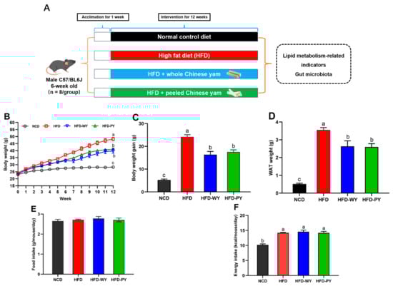 Effects of WY and PY supplementation on body weight, white adipose tissue (WAT) weight, and food and energy intake. (A) Specific experimental protocols. (B) Changes of body weight. (C) Body weight gain. (D) WAT weight. (E) Food intake. (F) Energy intake. Means with different letters on the bar charts represent significant differences (p < 0.05).