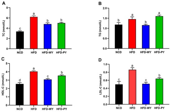 Effects of WY and PY supplementation on serum biochemical profiles. (A) TC. (B) TG. (C) HDL-C. (D) LDL-C. Means with different letters on the bar charts represent significant differences (p < 0.05).