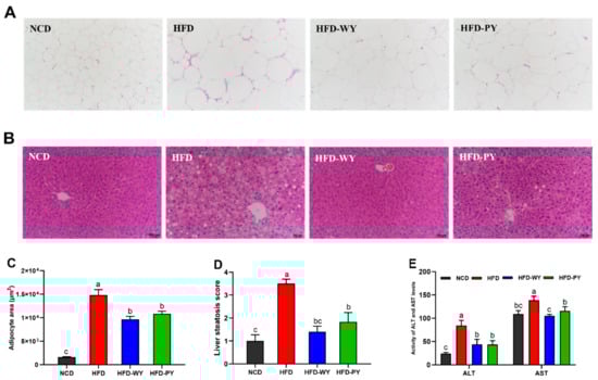As shown in Figure 3A, compared with the NCD group, the adipocytes in the HFD group were apparently enlarged in size and loosely arranged in a disordered manner, whereas the adipocytes tended to be uniformly arranged after the WY and PY consumption. Furthermore, the adipocyte area was significantly lower in the HFD-WY and HFD-PY groups than in the HFD group (Figure 3C, p < 0.05). The liver histological examination of mice revealed that, in the NCD group, hepatocytes around the central vein were arranged radially with a regular and tight distribution (Figure 3B). On the contrary, hepatocytes in the HFD group underwent multiple cycles of cytoplasmic vacuolization and marked hepatic steatosis, indicating that liver tissue was damaged. Following the WY and PY interventions, liver tissue damage was notably ameliorated, with increased similarity to the NCD group, which was supported by the significantly lowered liver steatosis score (Figure 3D, p < 0.05). In addition, the levels of liver injury biomarkers (ALT and AST) were determined. The results show that ALT and AST levels in the HFD-WY and HFD-PY groups were significantly lower than those in the HFD group, and WY was significantly more capable than PY of reducing the AST level (Figure 3E, p < 0.05). The above evidence proves that WY and PY could significantly attenuate HFD-induced adipocyte abnormalities and liver injury.