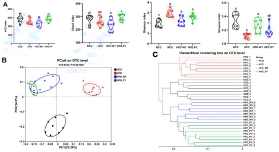 Effects of WY and PY supplementation on the α and β diversities of gut microbiota. (A) α diversity. (B) PCoA score plot. (C) Hierarchical clustering based on the unweighted-unifrac distance matrix. Means with different letters on the charts represent significant differences (p < 0.05).