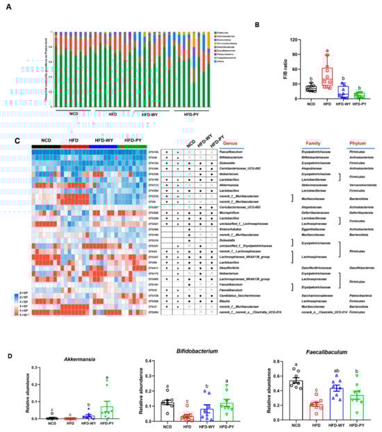 In order to evaluate specific microbial populations in mice under WY and PY consumption, the relative abundances of different groups were analyzed at the phylum and genus levels. At the phylum level, all groups were dominated by Firmicutes, Actinobacteria, and Bacteroidota (Figure 5A). Firmicutes and Bacteroidota affected the organism’s intake and catabolism of dietary nutrients, thus the ratio of Firmicutes to Bacteroidota (F/B) was regarded as a crude and simple indicator of flora monitoring. The F/B ratio was significantly higher in the HFD group compared to the NCD group. However, the interventions of WY and PY significantly prevented the elevated F/B ratio caused by HFD, but there was no significant difference in their effects (Figure 5B, p < 0.05).