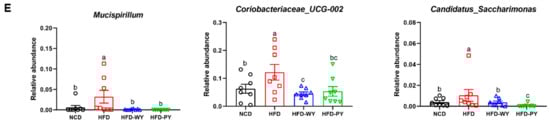 LDA performed by LEfSe clarified the dominant bacterial community in each group. We have further demonstrated significant differences in specific bacterial taxa in the HFD group after 12 weeks of WY and PY interventions from different taxonomic systems. As shown in Figure 6, at the phylum level, the HFD group was enriched by dramatic increases in the Coriobacteriaceae_UCG_002 and Mucispirillum, which may be main indicators of abnormal lipid metabolism. In addition, the characteristic bacterial genera in the HFD-WY and HFD-PY groups included Faecalibaculum, Bifidobacterium, and Akkermansia, which is consistent with the above results.
