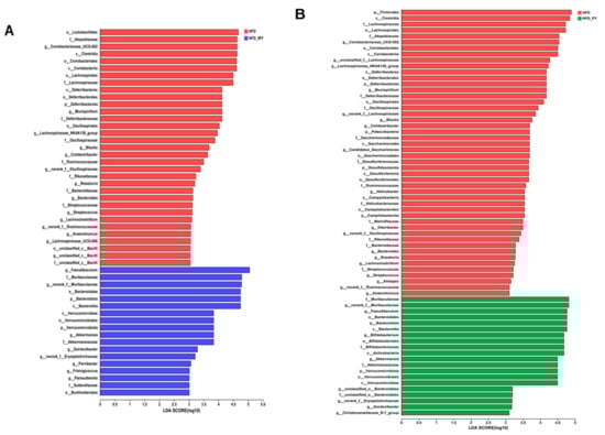 LDA scores obtained from LEfSe analyses, LDA score > 3.0. (A) HFD vs. HFD-WY. (B) HFD vs. HFD-PY.