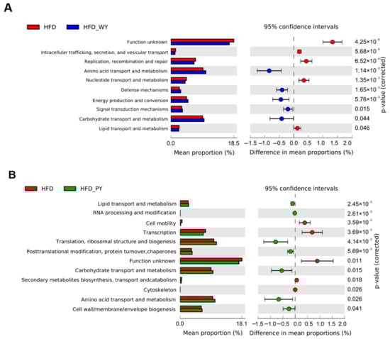 Changes in the gut microbiota composition frequently lead to variations in metabolic pathways and functions. Therefore, 16S functional prediction analyses were performed by PICRUSt2 analysis and Clusters of Orthologous Genes (COG) database comparisons (Figure 7). The results show that WY and PY supplementation significantly affected 10 and 12 metabolic pathways, respectively. They jointly up-regulated amino acid and carbohydrate transport and metabolism. In addition, PY supplementation has a remarkable regulatory effect on lipid transport and metabolism, while energy production and conversion were significantly enriched in the HFD-WY group.