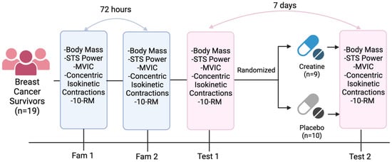 A convenience sample of n = 19 females in Columbia, South Carolina (USA) previously treated for breast cancer was recruited to participate in this study using posted flyers at the local oncology facilities and community cancer-related events. Interested participants completed an online screening form regarding their health status, current intake of nutritional supplements, and previous exercise history. Participants were excluded from the study if they were actively receiving breast cancer treatment, the location posed a problem, or they were currently supplementing with creatine. Additionally, participants were excluded if their health status was deemed unsafe for exercise and supplementation, posing a risk to the individual (e.g., previous injury, cardiovascular condition, or bone metastases). Interested and eligible individuals gave informed consent prior to the start of any study activities. This study was approved by the University of South Carolina’s Institutional Review Board (Pro00119366).