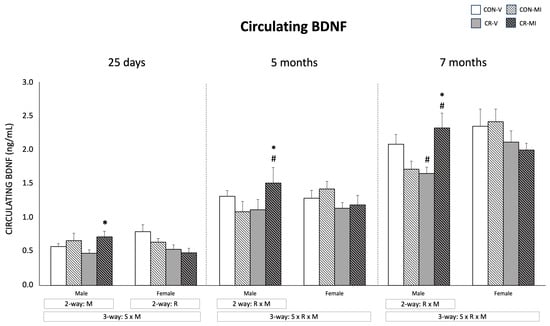 Plasma BDNF levels of male and female rats at 25 days, 5 months, and 7 months of age. Data are means ± SEM. Statistics: Three-way ANOVA was conducted to investigate the impacts of gestational calorie restriction (R), myo-inositol treatment (M), and/or sex (S). Within each sex, two-way ANOVA was used to assess the effects of R and/or M. Student’s t-test was used for individual group comparisons: *, different from their corresponding vehicle-supplemented group; #, different compared to their corresponding control group. Abbreviations: control (CON), gestational calorie-restricted (CR), vehicle (V), myo-inositol (MI).