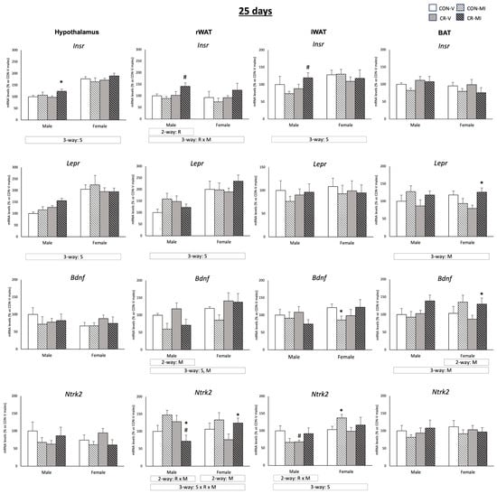 Figure 3 shows the mRNA expression levels of Insr, Lepr, Bdnf, and Ntrk2 at 25 days. MI supplementation resulted in greater Insr mRNA levels in the hypothalamus of the CR male animals in comparison to CR-V (Student’s t-test). Furthermore, the CR-MI animals exhibited higher Insr expression in both the retroperitoneal and inguinal WAT depots compared to the CON-MI animals (Student’s t-test). The Bdnf mRNA levels in the rWAT were reduced by the MI treatment (three-way ANOVA), especially in the males (two-way ANOVA). Additionally, the CR-MI females had elevated Bdnf mRNA levels in the rWAT in comparison to the CON-MI females (Student’s t-test). In the iWAT, the CON-MI females displayed lower mRNA levels of Bdnf than the vehicle-treated controls (Student’s t-test). The MI treatment also led to an upregulation of Ntrk2 mRNA expression in the rWAT of the male controls (p = 0.053, Student’s t-test), whereas it led to a decreased expression in the CR males compared to their vehicle-treated counterparts (two-way ANOVA, interactive effect between calorie restriction and MI supplementation; and Student’s t-test). In the iWAT, the CR males treated with the vehicle, but not those treated with MI, displayed lower mRNA levels of Ntrk2 than their controls (Student’s t-test). In the females, Ntrk2 mRNA expression in the rWAT and iWAT (the latter only in the CON animals) increased due to MI supplementation compared to the vehicles (two-way ANOVA, Student’s t-test). In the BAT, MI supplementation also resulted in higher mRNA levels of Bdnf and Lepr in comparison to the vehicle-treated counterparts (three-way ANOVA). Of note, the expression levels of the aforementioned genes were different depending on the sex of the animals. The female rats displayed higher expression levels of Insr (in the hypothalamus and iWAT), Lepr (in the hypothalamus and rWAT), Bdnf (in the iWAT), and Ntrk2 (in the iWAT) than the males (three-way ANOVA).