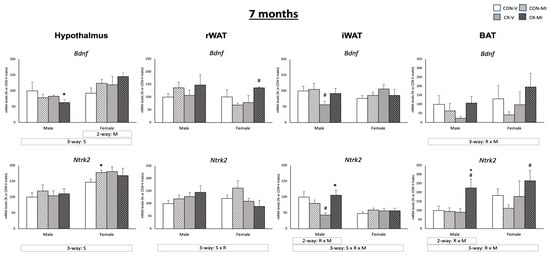 Expression levels of Bdnf and Ntrk2 genes in the hypothalamus, retroperitoneal and inguinal white adipose tissue (rWAT and iWAT), and brown adipose tissue (BAT) of 7-month-old offspring from controls (CON) and calorie-restricted (CR) dams during gestation, treated with either vehicle (V) or myo-inositol (MI) during the lactation period. mRNA levels are expressed as a percentage of the value for the CON-V male rats. Data are mean ± SEM. Statistics: Three-way ANOVA was conducted to investigate the impacts of gestational calorie restriction (R), lactational myo-inositol treatment (M), and/or sex (S). Within each sex, two-way ANOVA was used to assess the effects of R and/or M. Student’s t-test was used for individual group comparisons: *, different from their corresponding vehicle-supplemented group; #, different compared to their corresponding control group.
