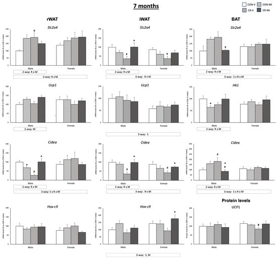 At 7 months of age, no significant differences were found in the body weight and body fat content due to maternal conditions or MI treatment, as previously described [13]. No differences were found regarding the weights of the rWAT and iWAT depots either. However, concerning the BAT, the CR males, irrespective of treatment with MI, exhibited a lower weight compared to their controls, whereas the CR females showed a higher weight than their respective controls (two-way ANOVA). Additionally, among the females, CR-MI displayed a greater BAT weight than CR-V (Student’s t-test).