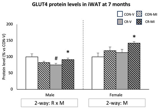 Figure 7 shows the GLUT4 protein levels in the iWAT at the age of 7 months. The CR male animals treated with the vehicle showed a decrease in GLUT4 protein levels compared to their controls, whereas MI supplementation in this group led to increased levels (Student’s t-test). In the females, MI supplementation resulted in greater GLUT4 levels compared to their respective vehicle-treated controls (two-way ANOVA). This difference was more pronounced and significant by Student’s t-test in the CR females.