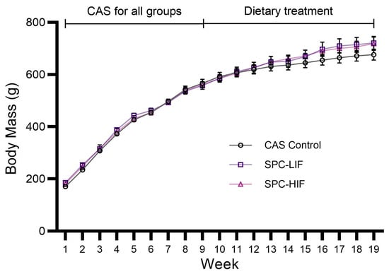 Rat body mass (BM) data from the beginning of the experiment (Week 1) to the end (Week 19) of dietary treatment (CAS control diet, SPC-LIF diet, or SPC-HIF diet) are shown in Figure 1. All groups of rats gained BM over the course of the experiment. BM did not significantly differ between any dietary groups.