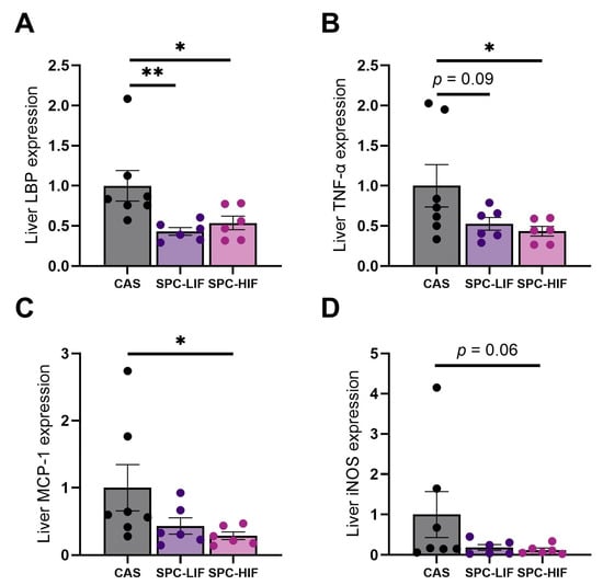 Liver expression levels (mean ± S.E.) of lipopolysaccharide-binding protein (LBP) (A), tumor necrosis factor α (TNF-α) (B), monocyte chemoattractant protein 1 (MCP-1) (C), and inducible nitric oxide synthase (iNOS) (D) in obese Zucker rats fed CAS, SPC-LIF, and SPC-HIF diets. Data are expressed as ratios to the CAS control group. * p < 0.05, ** p < 0.01 in post hoc tests between two groups.