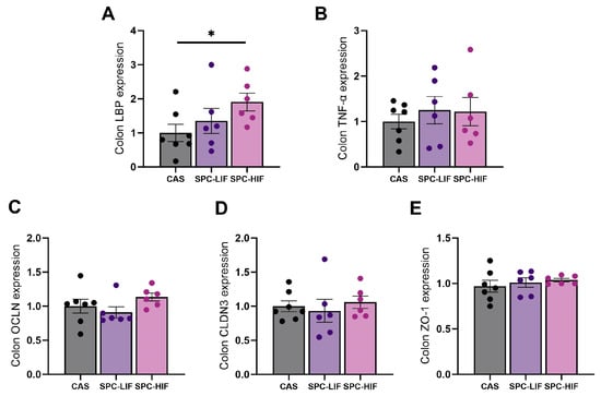 Because colon bacteria are the main source of LPS, to determine whether the differences in liver LBP and inflammatory gene expression between SPC diets and CAS control was a result of differences in LPS originating from the colon or differences in colon permeability, we measured the expression of LBP, TNF-α, and colon permeability markers occludin (OCLN), claudin 3 (CLDN3), and Zonula Occludens-1 (ZO-1). Counterintuitively, SPC-HIF diet-fed rats had significantly higher levels of LBP expression in the colon compared to CAS control diet-fed rats (Figure 3A). There were no differences in expression levels of TNF-α or epithelium permeability markers in the colon between any groups (Figure 3B–E).