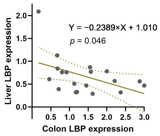 The negative correlation between liver LBP expression and colon LBP expression in obese Zucker rats (p = 0.046) when LBP expression data from CAS, SPC-LIF, and SPC-HIF groups are combined. Each circle represents an individual rat. Dashed lines indicate 95% confidence interval.